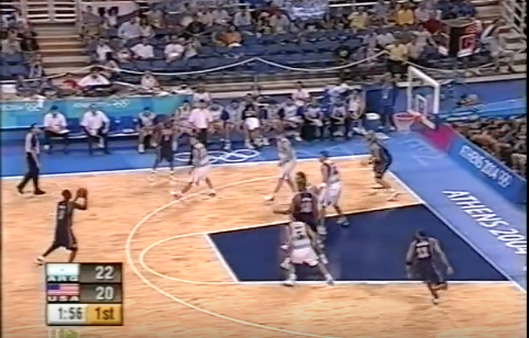 Of course if Ray Allen hadn’t have been attending to the birth of his child, that drop-zone could have been busted. But more or less every time a US player caught a cross-court pass, he drove back into traffic. Perhaps led equally by a lack of experience in facing a strong-side overload in the very early years of the post-illegal-defense era of the NBA as by Larry Brown’s “play the right way” diktat, they steered right into their opponent’s game plan.