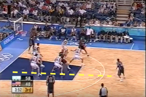 You can see the whole game above in glorious 2004-era LD. What jumps out in the first few minutes is just how unfamiliar it is in 2016. Beyond the trapezoid key (short pause to reflect), this is how Argentina cut off access to the rim, which is where the US team tried to get the majority of its points. Not only was the three point line shorter, but opposing teams barely had to venture out of the paint. The image shows the blueprint - double team Tim Duncan, cheat way off the three point line, make sure there is always more than one defender between the ball and the rim.