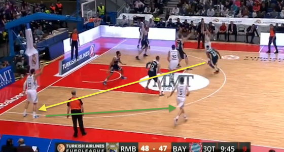 In the image above, Llull has gone over Bourousis’ pick and is about to fire the ball to an open Mirotic in the corner (shown as the yellow arrow) who will then fire it to Rudy (green arrow) who will drain the three. Benzing has helped over on the roll man, Bourousis, and will eventually make it nearly back out to Rudy, a metre or so behind the three point line, but hesitates on fully closing out. Rudy drained the three anyway.